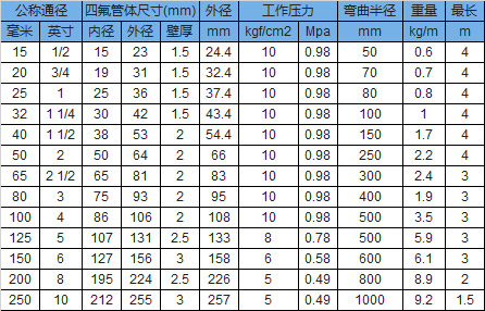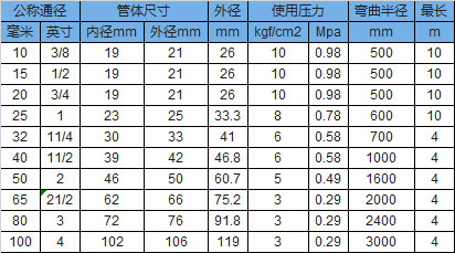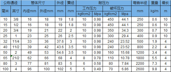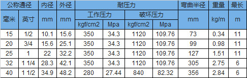 聚四氟(fú)已烯軟管超高壓編網型參數
